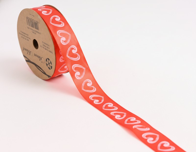 Saténová stuha s bílými srdíčky, šíře 25 mm, červená