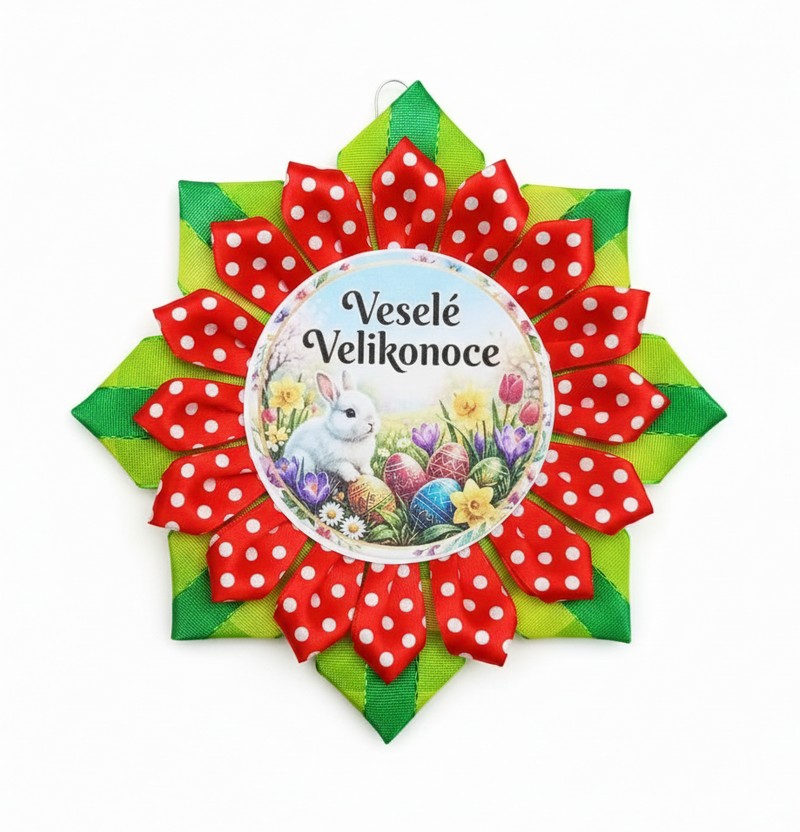 * Střed kokardy zdobí obrázek s velikonočním motivem – zajíček, jarní květiny a barevná vajíčka s textem „Veselé Velikonoce“.