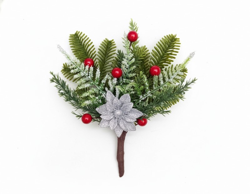 * Umělé větvičky jehličnanů: Obsahuje několik druhů, které napodobují přirozený vzhled jehličnatých stromů, čímž dodávají aranžmá realistický a zimní vzhled.